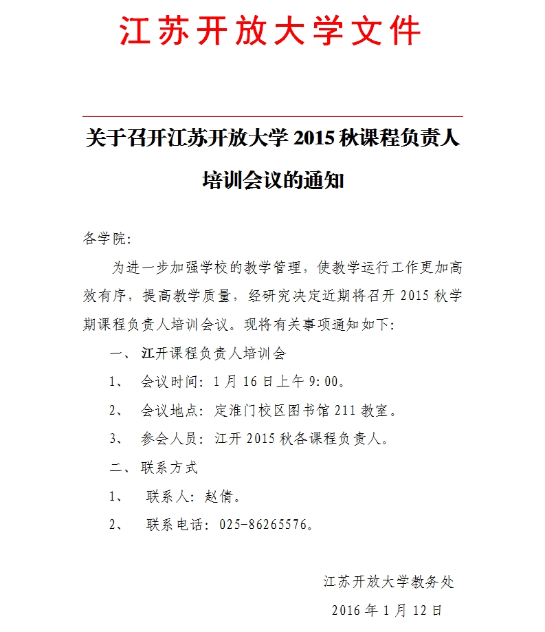 关于召开江苏开放大学2015秋课程负责人培训会议的通知