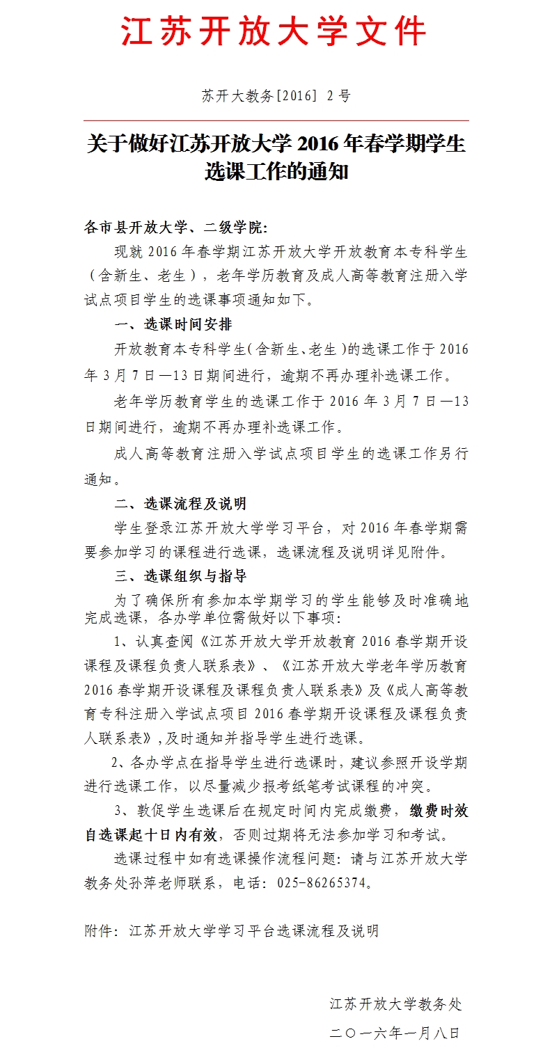 关于做好江苏开放大学2016年春学期学生选课工作的通知