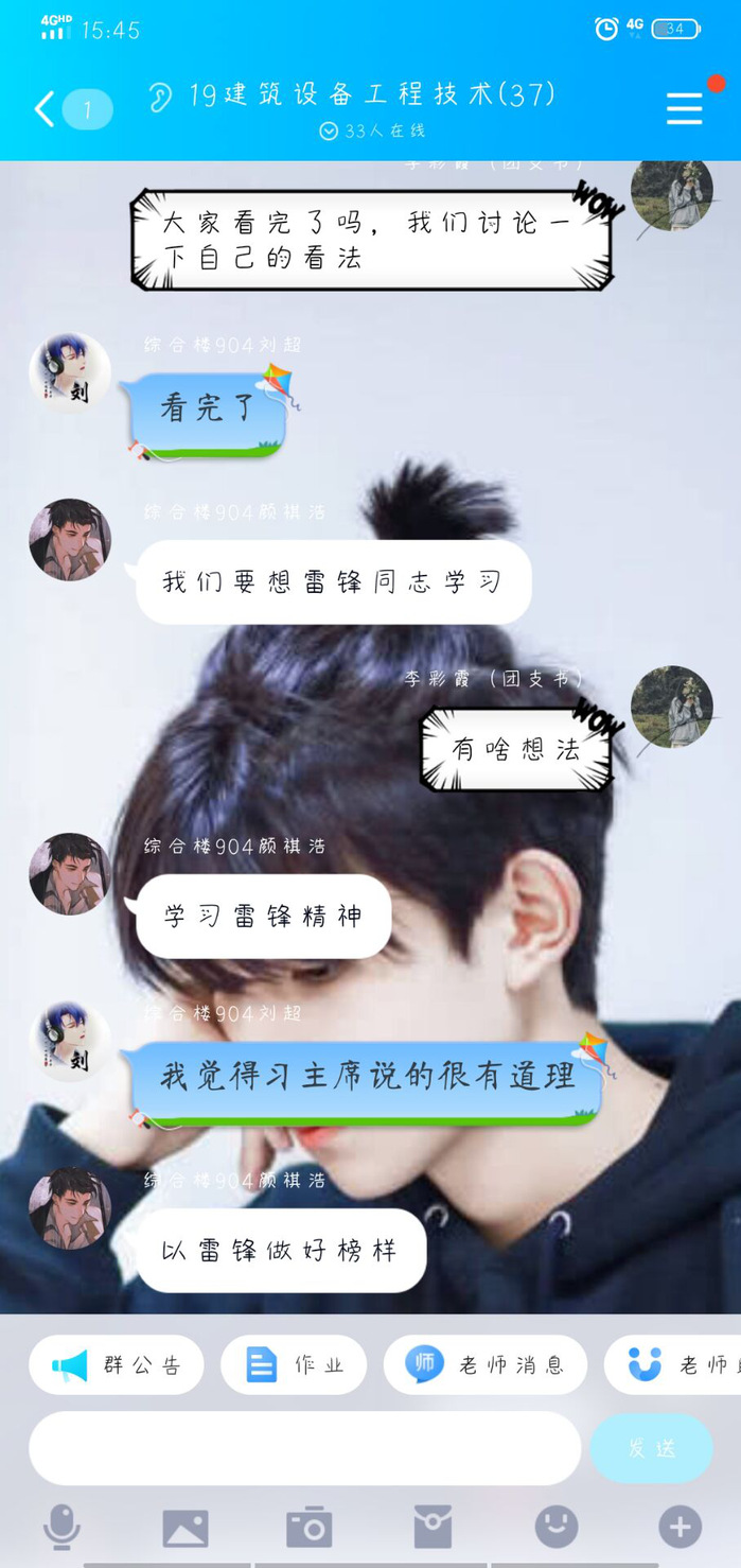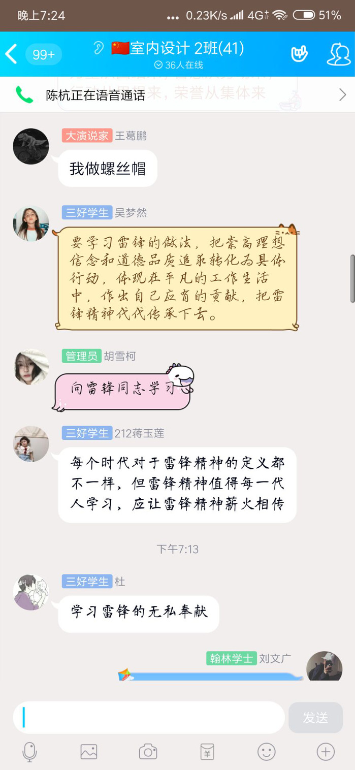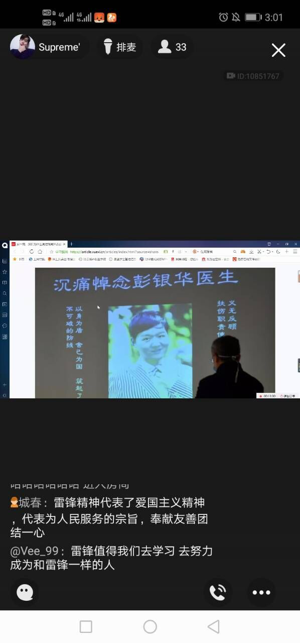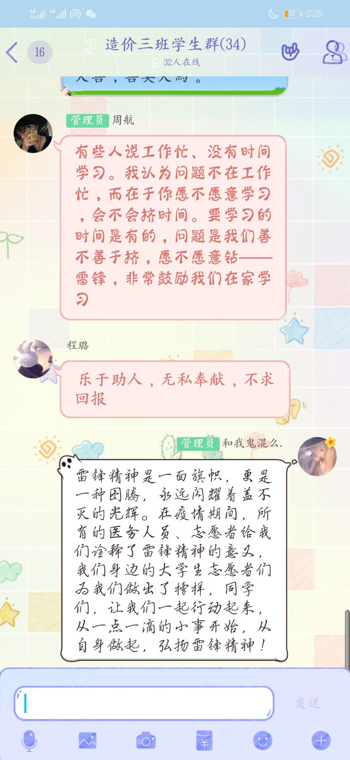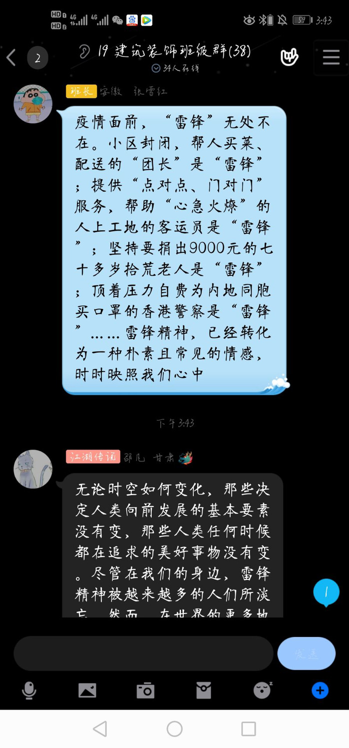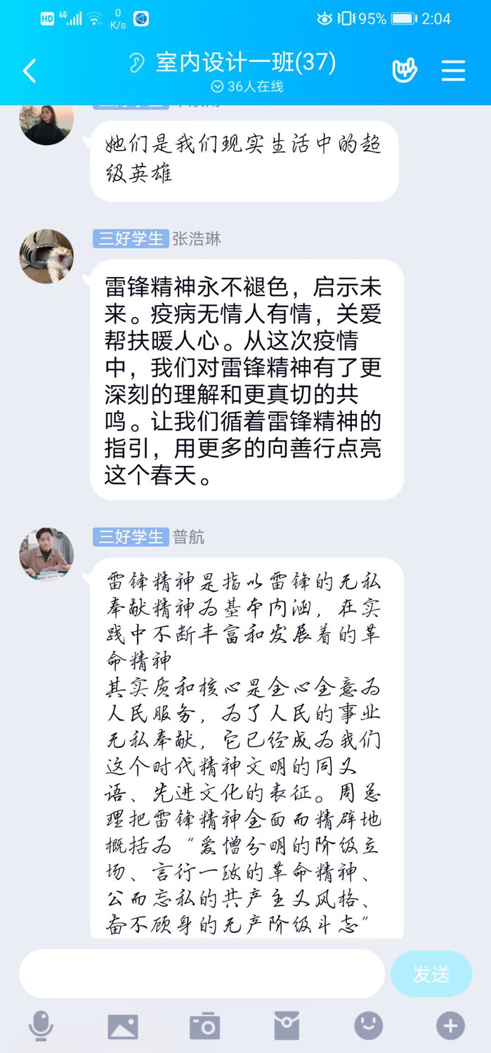 各班同学在团支书带领下观看了视频《习近平讲述的故事:雷锋,永恒的精神坐标》和新华社文章《这一刻,我们为什么更理解更怀念雷锋?》,并围绕学习视频和文章开展了线上讨论。同学们纷纷表达自己所理解的雷锋精神、对此次战“疫”中的医护志愿者、社区志愿者、身边同学在一线参与防控志愿者等事迹展开了热议,同学们纷纷表达了对新时代“雷锋”的敬仰,并结合自身实际进行讨论,大家踊跃发言,纷纷表示要学习雷锋向上的人生姿态和向善的价值追求,从自身做起,从小事做起,积极践行雷锋精神。