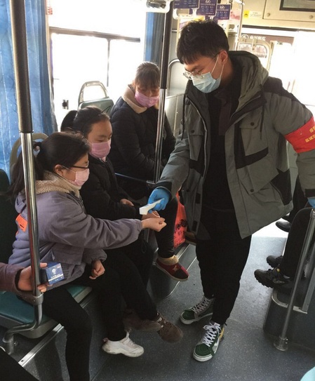 面对突如其来的新冠肺炎疫情,举国上下、各行各业都参与到这场严峻的疫情阻击战中。现响应盐城市人民政府复工有关要求,交通系统要有专门的防疫员,来登记市民身份信息,电话号码,防护措施。响应党和共青团的号召,在保护好自己的同时,孙铭浩参加了盐城公共交通防疫员队伍,负责给乘坐公交车的市民测量体温。抗疫的责任不仅仅在于前线的医护人员,在后方身为共青团员的我们在做好个人防护的同时,也应该付出自己的一份力量。
