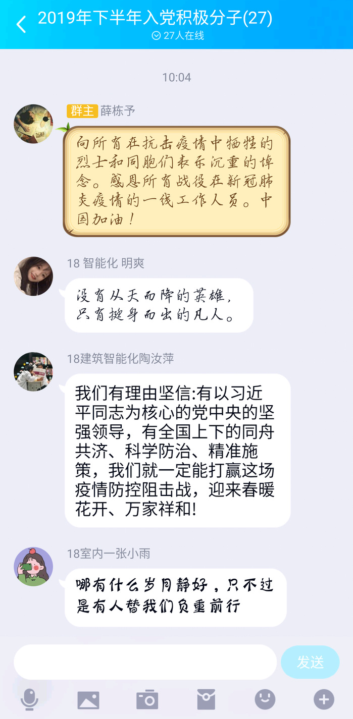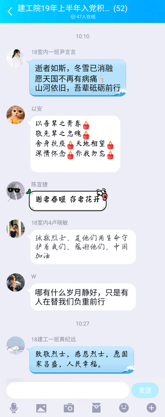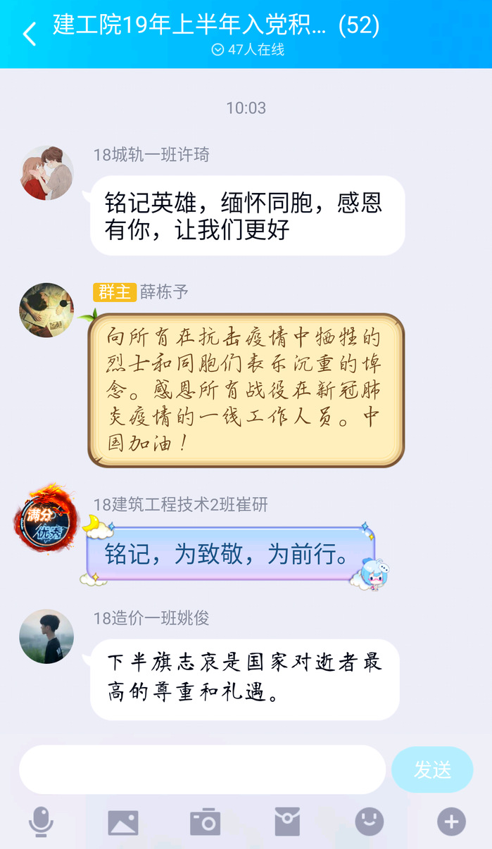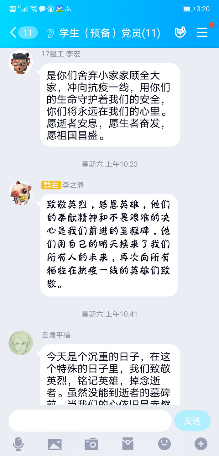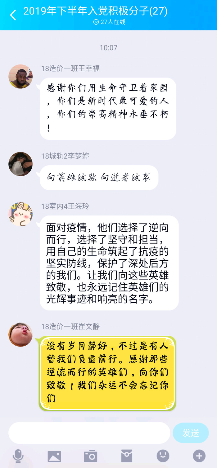 建筑工程学院第二党支部还组织了学生党员、入党积极分子学习新冠肺炎疫情防控中牺牲烈士事迹并在线上进行了讨论。同学们向所有在抗击疫情中牺牲的烈士和同胞们表示沉重的悼念,为牺牲的烈士和逝去同胞寄去哀思,愿凛冬消散,春暖花开后,人间皆安,山河无恙,再无国殇。