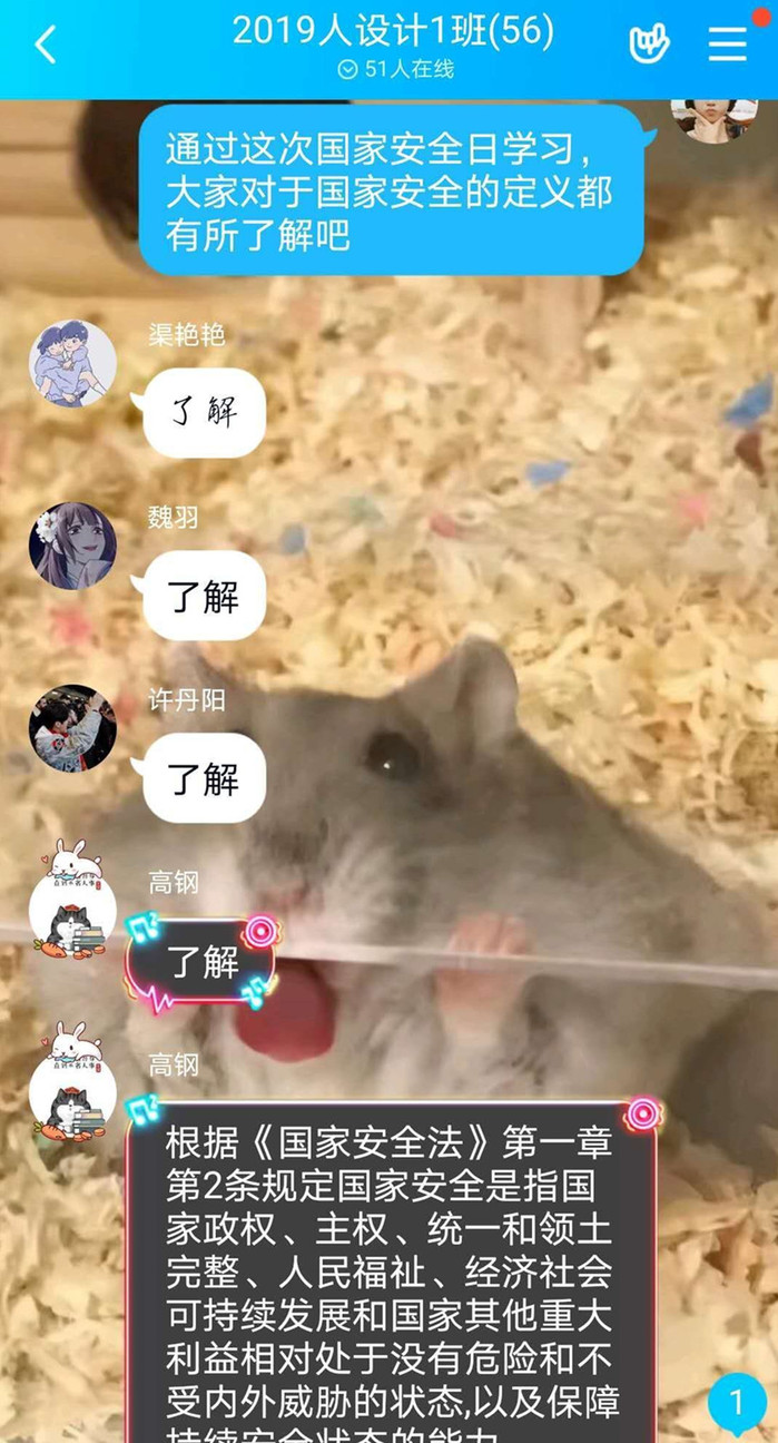 在共上一堂国家安全教育课的基础上,各班班主任于4月16日-17日利用QQ群、腾讯会议等网络媒体,聚焦国家安全教育主题,紧密结合新冠肺炎疫情防控工作,分别开展了线上班会活动。有的班级通过典型案例向同学们讲述大学生应当如何维护国家安全,增强防范和抵御安全风险的能力;有的班级结合近期新冠肺炎疫情、网络安全、反恐怖主义、反间谍、核安全等各种安全问题,提醒学生要认真了解传染病防治法、国家安全法、网络安全法、反恐怖主义法、反间谍法、核安全法等法律法规;有的班级以知识问答的形式,共同探讨国家安全知识,做到互学互帮互促,强化了学生的国家安全意识。此外,各班级还组织学生参与国家安全知识在线问答,进一步巩固了大家对国家安全知识的理解。