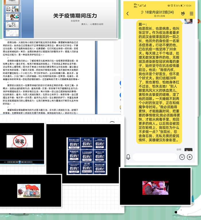 各班级在班主任和辅导员的指导下,利用QQ群、腾讯会议、钉钉等线上平台,就压力问题、网上学习以及情感家庭关系等问题展开了讨论。19广告1班和2班通过班会向同学们支招,如何纾解疫情防控期间产生的压力。18广告1班、19广制1班等几个班级提倡同学们学习楷模,树立正确的情感观。各班还分别就抵制和辨别网络谣言、网络课堂遇到的学习困难、在线寻找实习单位等各种具体问题展开讨论,分享并学习疫情防控中青年志愿者的先进事迹、感动人物和感动瞬间,倡导同学们做好情绪调节,保持健康积极的心理状态,聚焦学业,团结互助,携手前行。