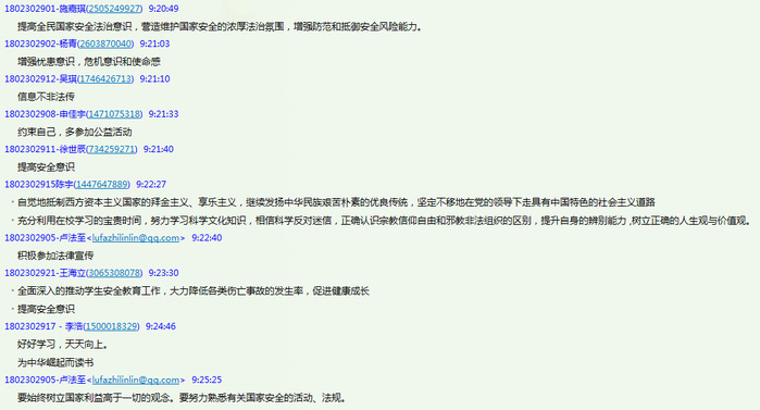 同学们还积极围绕“个人怎样参与到维护国家安全中去?”等话题参与线上讨论,纷纷表示通过本次主题班会对国家安全有了更深刻的理解,通过安全教育的“零距离”互动和生动的案例学习,意识到表达爱国情怀要谨言慎行,国家安全无小事,要将维护国家安全的观念和行为融入到日常生活学习中去,共同营造国家安全的社会环境和法制氛围。