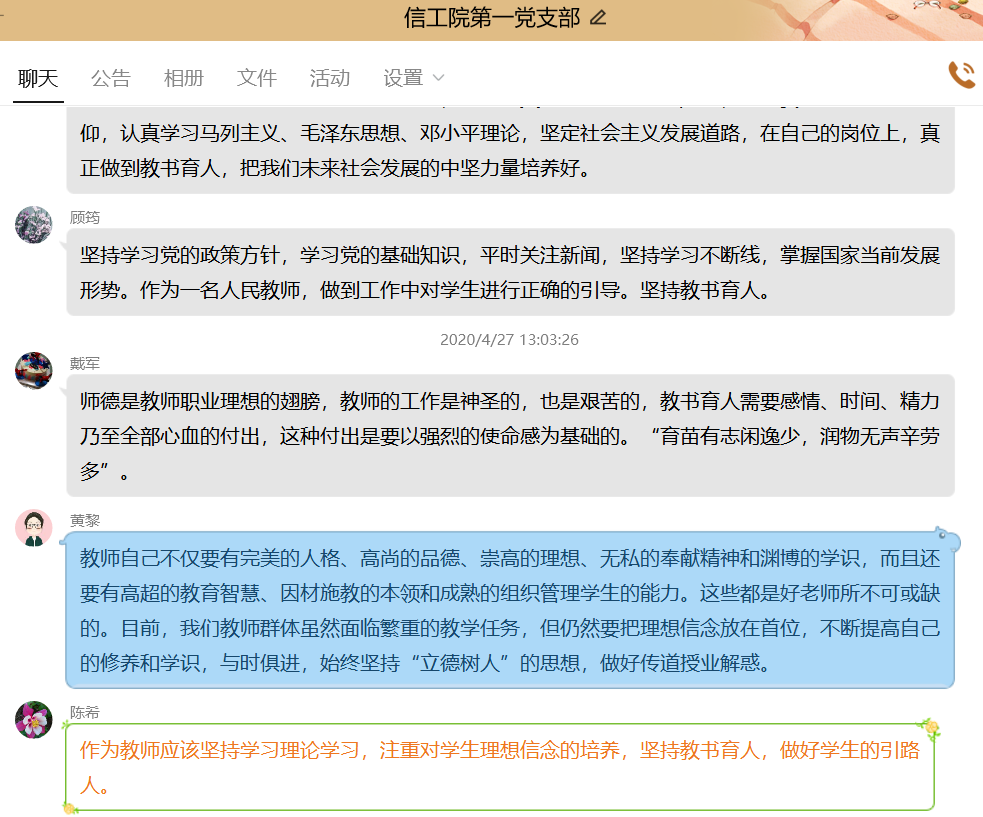 4月27日下午,信息工程学院第一党支部通过腾讯会议平台和QQ群,开展“坚定理想信念、做好本职工作”线上学习交流活动。活动由支部书记许小媛主持,支部全体党员参加。