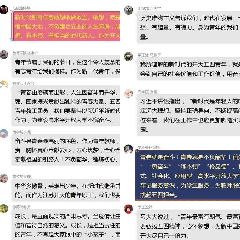 习近平总书记在五四青年节到来之际寄语新时代青年,他指出,青春由磨砺而出彩,人生因奋斗而升华。为了进一步学习领悟习近平总书记重要讲话,弘扬传承五四精神。5月4日,在校团委的指导下,教工团支部开展了线上“五四精神”大讨论活动,校团委副书记尹星以及二十多位教工团员参与了线上大讨论。