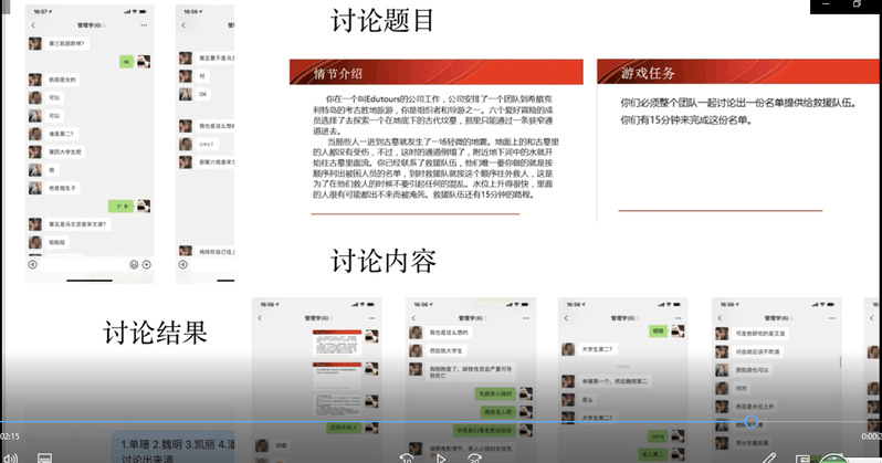 线下课程小组合作学习是近年来世界各国普遍采用的一种教改创新模式,管理学原理与实务课程也一贯坚持这一做法,效果也很好。但线上教学,在学生们“天各一方”的情形下,如何按照团队管理理念组建学习小组,是遇上的新难题。为了消除同学们的顾虑和困难,管玲俐老师不厌其烦,精心组织,经过四次磨合,各班级小组学习团队全部建成(共计34个学习小组)。每个小组团队都建立了自己的在线社区,有的是微信群,有的是QQ群,有的是钉钉群。“时间管理”“激励能力”“沟通能力”等教学内容全部通过小组合作学习完成各项能力训练。合作学习成果通过团队提交在线社区讨论截图、文字总结和视频总结进行评估,核定学习成绩。通过在线社区的小组合作学习,既实现了各章节的能力训练目标,同时又锻炼了同学们团队合作的能力,一举两得,学习效果颇为理想。