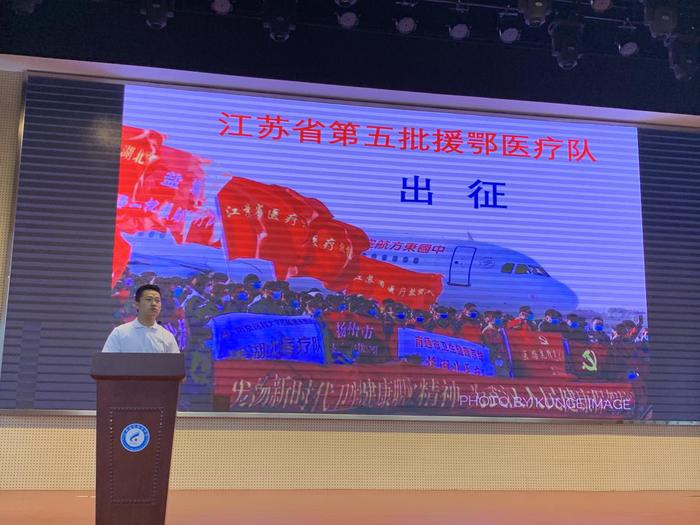 报告会邀请了江苏省第五批援鄂医疗队的2名成员:来自江苏省人民医院浦口分院重症医学科的副主任医师胡守震及江苏省人民医院浦口分院普外科护士长、主管护师储怡鑫。他们所在的团队在援鄂战“疫”中支援武汉同济医院光谷院区52天,取得了“医护零感染、患者零死亡”的成绩。