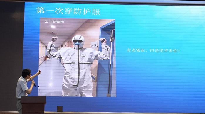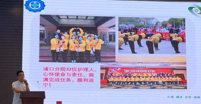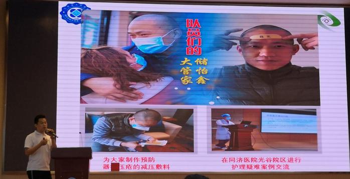 储怡鑫护士长是江苏省第五批援鄂医疗队-南京医疗二队-浦口医疗队联络员,获省级记功荣誉。他用一幅幅图片和大家分享了从报名应征到支援武汉52天里护理人精心守护患者的点滴故事,“我们临走前就做好了回不来的准备”、“每个人都特别认真的遵守防护步骤,不是担心自己被感染,而是担心自己被感染后影响他人和整个团队”、“在我们队伍中有许多年轻的医生护士,最小的是98年的,每个人都有自己的个性,但在这次支援行动中,每个个体都选择服从团队”、“最舍不得的是孩子,最对不起的是父母”,一句句朴实的话语体现了一名医护工作者为人子为人父的真实情感,更体现了医护团队专业、敬业的职业精神和英勇无畏、用血肉之躯守护人民群众生命安全的责任担当。