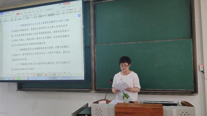 首先,党总支部组织委员周桔同志带领大家学习了学校《关于建立健全师德师风建设长效机制的实施办法》和《教师师德失范行为负面清单及处理办法》等文件制度,重点学习了在思想政治、教育教学、学术道德和工作生活作风共四个方面教师师德失范行为负面清单。
