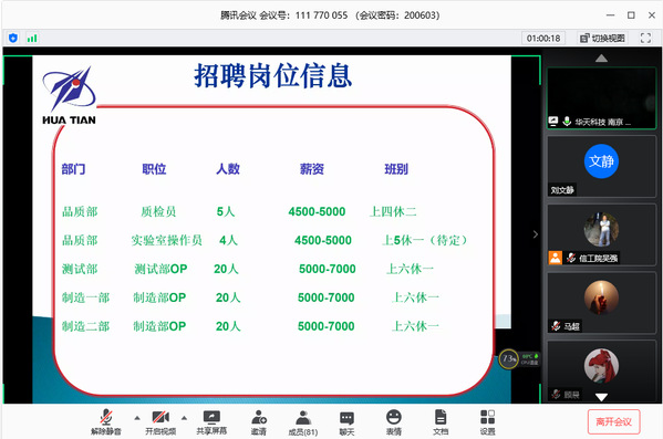 为全面做好20届毕业生就业工作,信息工程学院于6月3日上午9:30,在腾讯会议平台开展信息工程学院2020届毕业生就业动员会暨华天科技(南京)有限公司专场网络招聘宣讲会。会议由吴强副院长主持,华天科技(南京)有限公司人力资源部经理蒲军胜应邀参会,20届毕业生、毕业班班主任和辅导员也参加了会议。