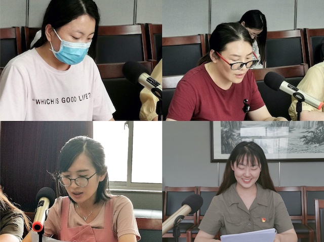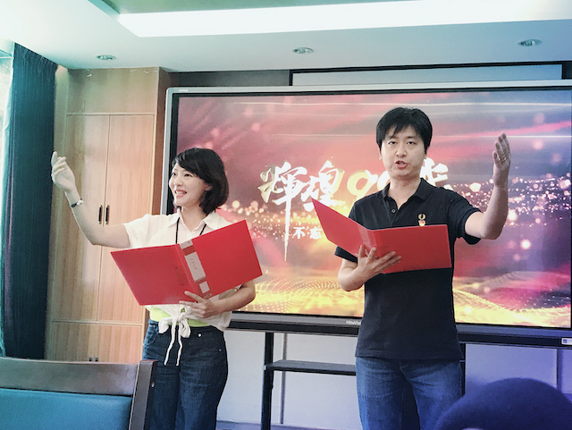 会议第三项,由高明和陶蕾伃老师带来深情饱满的诗歌朗诵《党赞》,诗歌表现了矢志不渝的红色情怀,热情讴歌了中国共产党建党99年来的光辉历程,表达了奋进新时代、共筑中国梦的坚定决心。