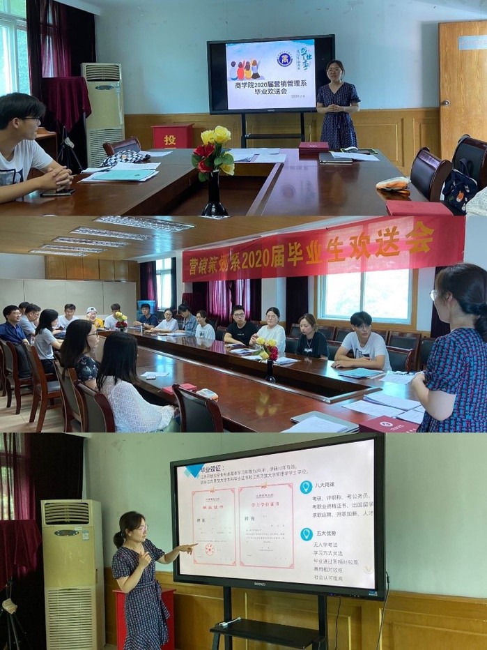 2020年7月6日,商学院营销管理系在东校区综合楼411举行2020届毕业生欢送会。营销管理系主任张玉艳、营销管理系全体教师以及2020届连锁经营管理班全体毕业生参加了本次欢送会。