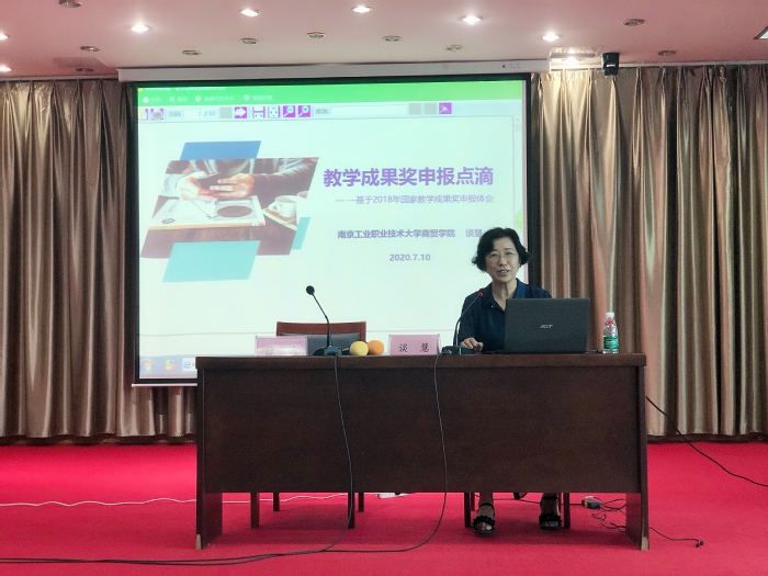 为更好地提升学院教学成果的培育质量,为教学成果奖申报打好基础,7月10日上午,商学院在定淮门东校区五楼报告厅举办了高职教学成果奖申报培训,邀请到南京工业职业技术大学商贸学院物流教学部主任谈慧教授担任教学成果奖申报系列培训职业教育专场的主讲嘉宾。培训会由商学院副院长徐永兵主持,商学院全体教职工参加了本次培训。