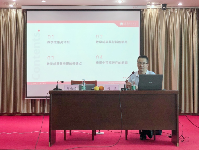 何教授首先对教学成果奖的界定、特点、类别以及申报条件进行了详细的解读。随后,何教授以其团队2018年荣获国家级教学成果奖本科组二等奖、江苏省特等奖的教学成果申报内容作为案例,对申报材料的填写与支撑材料的准备,特别是成果简介撰写与创新特点凝练,进行了细致入微的讲解。接着,何教授针对教学成果奖申报的关键点逐一进行了分析,建议老师们在申报时要学会以专家的身份换位思考。最后,就申报中可能存在的问题,何教授举例进行了介绍。