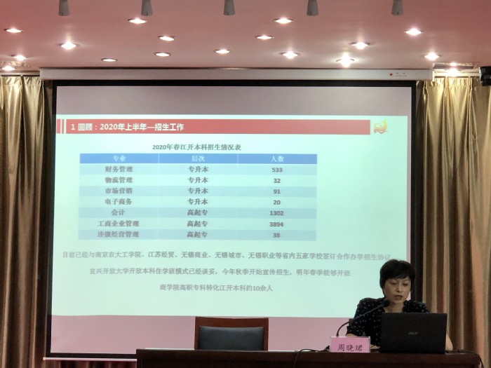 周晓珺做了题为“转型发展、向上突破”的专题报告,总结了学院“十三五”规划完成情况、对学院发展现状作了SWOT分析,介绍学院学科专业课程一体化建设规划。她从学科建设、人才培养、科学研究、招生工作、就业工作、质量工程、师资队伍、校企合作等方面回顾了“十三五”规划和2020年上半年相关工作成果。她分析了学院发展面临的机遇和挑战,以及自身的优势和不足,详细介绍了学科专业课程一体化建设的指导思想、总体目标、分项目标与建设措施,列出主要指标和规划表,明确了转型发展、向上突破的总体目标和要求。