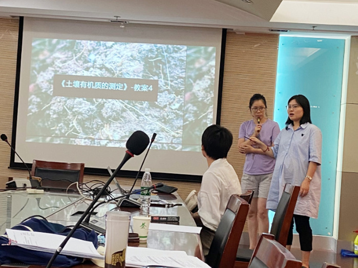 本次赛场模拟比赛的评委由环境生态学院院长干方群、副院长秦品珠和2019年江苏省教学能力大赛三等奖获得者关莹老师组成。教学团队首先根据大赛的流程进行了抽签、实施报告介绍、无生教学展示及现场答辩环节的模拟。评委们从不同的角度进行了点评,指出无生教学展示环节相对薄弱。随后,教学团队把其他教案都进行了展示,评委一一进行点评,一起探讨如何提升比赛现场的个人表达和现场控制能力。