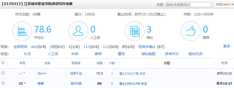 由学校教务处牵头、外国语学院主办的2020年江苏城市职业学院英语写作竞赛暨2020年“外研社杯”全国英语写作大赛(高职组)校级选拔赛于9月26日上午9:30-10:30如期举行,共有68名学生在句酷批改网展开了一场激烈的“云端角逐”。
