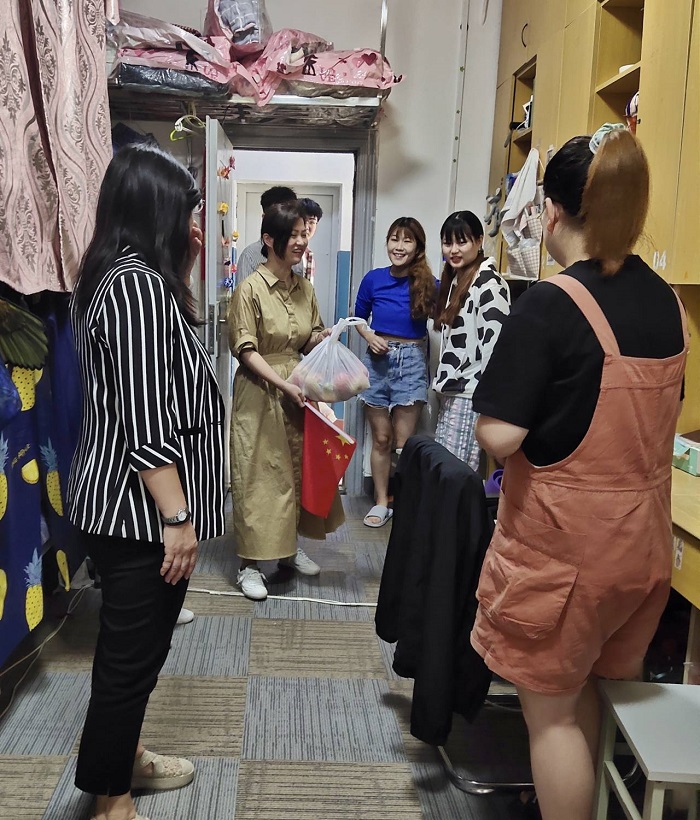 10月1日上午,设计学院院长姜春艳、党总支书记邹佳与学生干部一起前往宿舍慰问国庆期间留校的学生,为他们送去节日的问候。