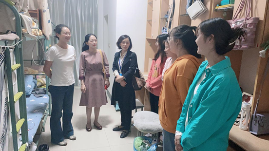 学院党总支部书记丁姝娟、副院长黄一斓、党总支部副书记张洁等来到宿舍看望新生,询问同学们的住宿条件和生活情况,希望同学们尽快适应大学生活,及时与老师、同学沟通交流,认真完成学业。