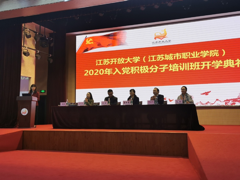 江苏开放大学(江苏城市职业学院)两个校区的2020年入党积极分子培训班于10月28日中午和晚上,分别在东校区图书馆和应天校区,成功举行了开学典礼。校党委副书记、副校长金丽霞同志,党委常委、党委宣传部部长、马克思主义学院院长季海菊同志,商学院党总支书记袁寿荣同志,设计学院党总支部书记邹佳同志,信息工程学院院长华永平同志,党委学生工作部部长刘涛,信息工程学院党总支副书记顾晨,艺术学院(健康学院)党总支副书记张洁,分别出席了两个校区的开班典礼。本次培训班共有294名学生学员及9名教工学员组成。两个校区的开班典礼分别由设计学院学生党支部书记焦娜和环境生态学院党总支书记段英主持。