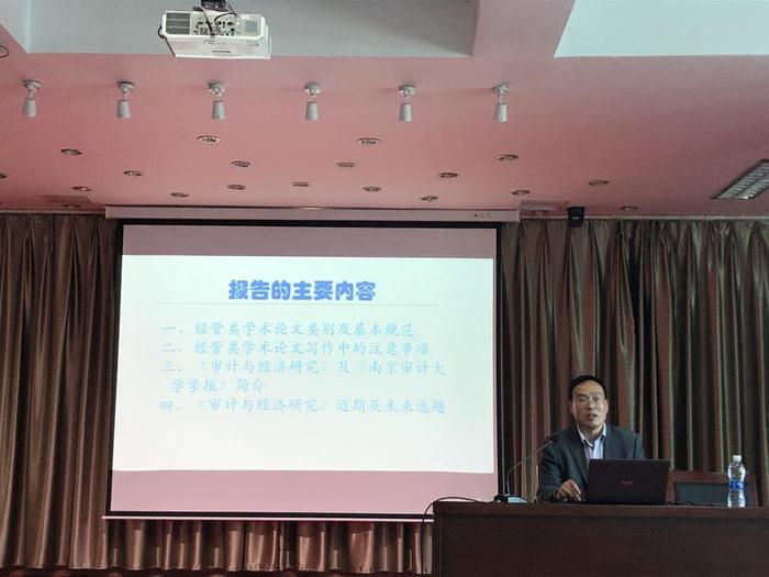 岳贤平教授主讲的题目为《经管类学术论文类别及规范》,他主要从经管类学术论文类别及基本规范、经管类学术论文写作中的注意事项、《审计与经济研究》及《南京审计大学学报》简介、《审计与经济研究》近期及未来选题四个方面跟大家分享了自己在高水平论文写作和发表上的经验和想法。岳教授首先谈到经济管理类学术论文主要分为五大类,即概念模型类论文、数量分析类论文、数理分析类论文、案例分析类论文和综合分析类论文,接着详细介绍了每一类论文的基本概念、基本规范以及在写作中应该注意的事项,如政治站位要准确、研究问题要明确、核心组成部分要完整等。最后,岳教授还向大家介绍了关于《审计与经济研究》和《南京审计大学学报》两本期刊的学术影响力、稿件录用情况和期刊主要栏目,并鼓励老师们积极投稿。