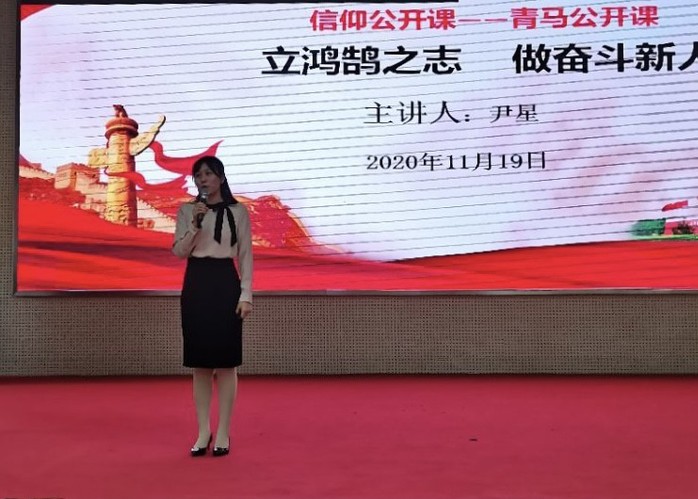 开班仪式后,校团委副书记尹星为全体学员主讲第一课---《立鸿鹄之志,做奋斗新人》,从何为新时代青年和新时代青年的使命与担当两个方面做了解答。尹书记从古今中外的先进青年出发,阐释了什么是新时代青年。从青年应志存高远、忠于祖国,努力做新时代具有远大理想和坚定信念的爱国者;青年应敢于担当、勇于奋斗,努力做新时代具有责任意识和创新精神的建设者;青年应勤奋学习、锤炼身心,努力做新时代具有过硬本领和高尚品格的接班人三个方面,勉励同学们勇担新时代青年的使命和担当。