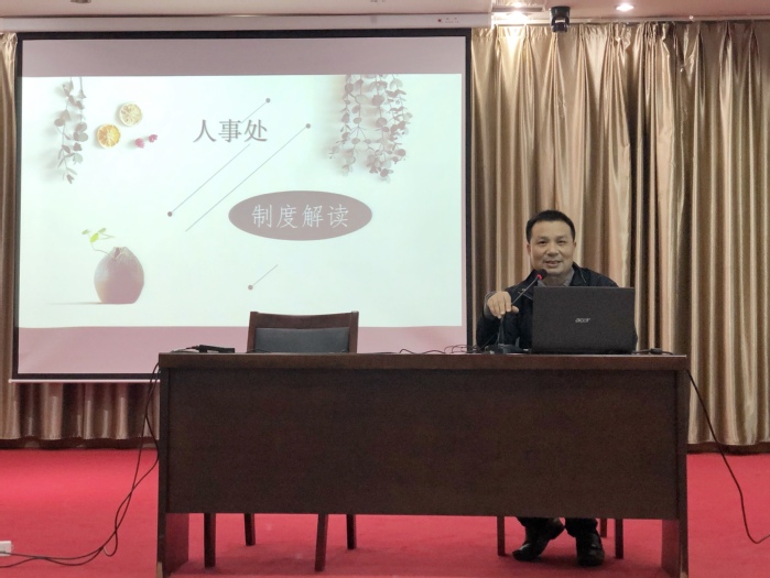 冯国刚处长主要从师德师风、职称评审、学历提升和岗位聘任四个方面对人事处的制度进行了解读。首先,冯处长针对之前下发给教师们的高校师风师德手册进行了简要说明,鼓励大家要爱岗敬业;接着他重点讲解了职称评审的相关政策,根据江苏省以及学校的职称评审办法文件依据,详细解读了职称评审的政策要点,冯处长强调教师在重视科研学术成果的同时,更要做好自己的本职工作;最后,冯处长简要介绍了关于学历提升和岗位聘任的相关文件,并提醒大家要多关注学校、学院的各类相关文件要求和通知。