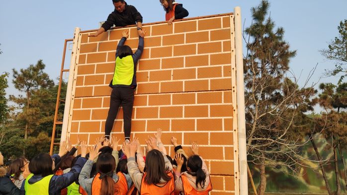 学院一直重视着青年教师们的成长,从青年教师入职第一天,就给他们配备了业务导师和思想政治导师,进行一对一帮助联系,定期开展活动,帮助他们成长。此次活动分为青年教师组(含导师)、中年教师组两个团队进行PK。教练带领大家进入了有趣的破冰活动和组队环节。选队长、取队名、定目标、呼口号、唱队歌,极大地调动了大家团队合作精神,教师们迅速进入了备战状态。随后,进行了“鼓动人心”、“卓越圈”、“求生墙”等拓展项目。在整个活动开展过程中,每位教师都踊跃参与,出谋划策,共同攻克难关,完成任务。最后一个要求老师们徒手翻越4.2米的高墙的“求生墙”项目把现场气氛推向了高潮。杨远院长和胡笳老师甘于奉献,主动担当“基座”,以肩为梯,给团队带来顽强的意志和力量;各位青年教师积极应战,抱着必胜的信念,勇敢地攀越高高的毕业墙。