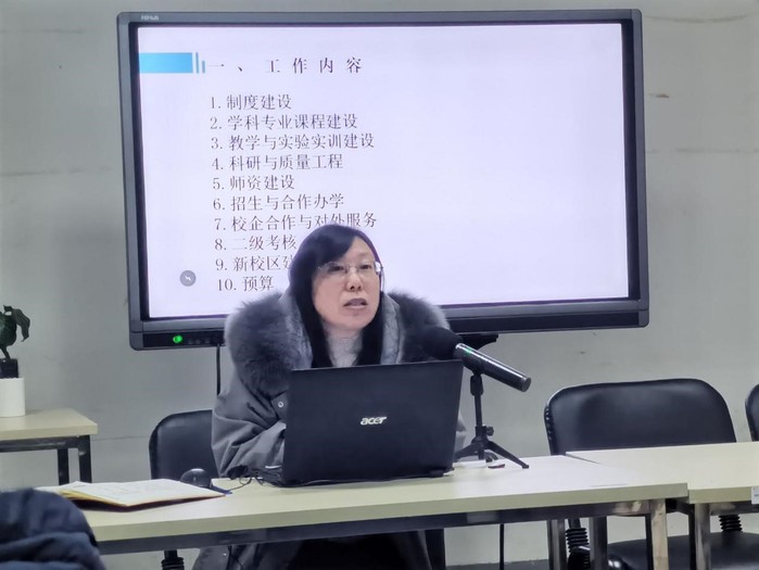 姜春艳主要从学院的制度建设、学科专业课程建设、教学与实验实训建设、科研与质量工程、师资建设、招生与合作办学、校企合作与对外服务、二级考核、学院财务预算等方面,对学院近期工作推进提出了具体要求,并对财务报销的有关流程和注意事项进行了培训。她强调,全院教职工要统一思想,紧抓期末这段时间,努力做好相关工作,为学院发展多做贡献。