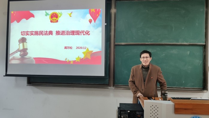 为加强教职工纪法教育、普及《民法典》知识,12月16日下午,外国语学院党总支部邀请了公共管理学院公共政策系龚万松副教授,在古平岗校区为学院全体教职工开展了主题为“切实实施民法典,推进治理现代化”的普法讲座。本次讲座由外国语学院党总支部副书记章琼主持。
