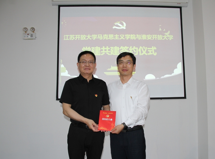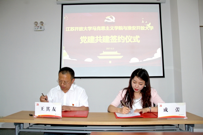 马克思主义学院党总支部书记成蕾与淮安开放大学开放社会教育学院院长王其友签署了党建共建合作协议。