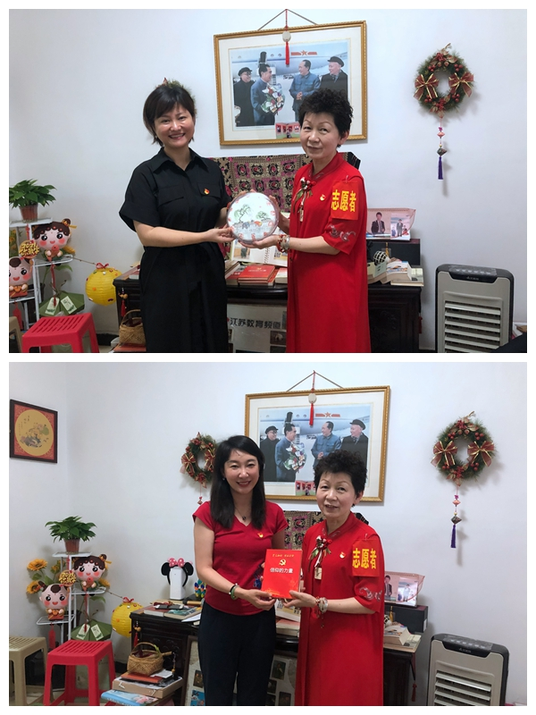 王玮向沈鸿介绍江苏开放大学作为一所新型大学肩负的历史使命与责任,以及学校在推进开放教育、职业教育、社会教育三类教育融合发展,推进江苏全民终身学习所做的努力,表示学校将通过“大学、平台、体系”积极传播江苏红色文化,在社会服务教育方面用好红色资源。学校资源建设处负责人张知慧同志代表学校调研组向“红色驿站”赠送了由学校自主开发摄制的红色纪录片《信仰的力量》。沈鸿代表“红果朗读会”、“红色驿站”向学校调研组回赠了家族亲人编写的红色历史《坎坷人生、矢志不渝》等书籍,以及她创作的普洱茶画《不忘初心、埋头苦干》。最后沈会长用英语和朝鲜语演唱了《东方红》和《金日成将军之歌》,将活动推向高潮。