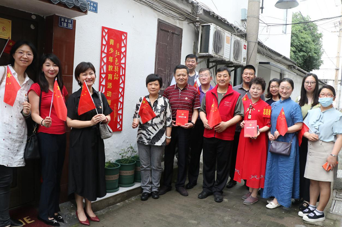 调研第一站,由江苏开放大学王玮一行与苏州开放大学管理委员会党总支书记薛铭等组成的红色资源调研组,来到了位于姑苏区双塔街网师巷社区居民沈鸿家的“红色驿站”。