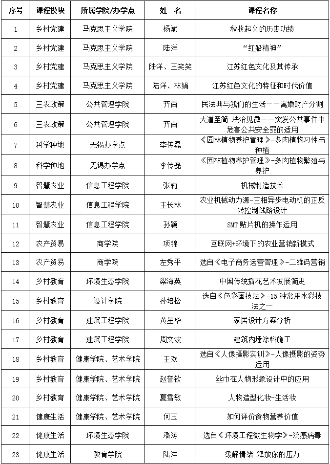 近日,江苏高校助力乡村振兴在线开放课程认定结果公示,我校《江苏红色文化及其传承》《多肉植物习性与种植》《中国传统插花艺术发展简史》等23门课程成功入选,入选课程总数位居江苏高校第7,实现了入选课程质量和数量的双提升,具体名单见表1。