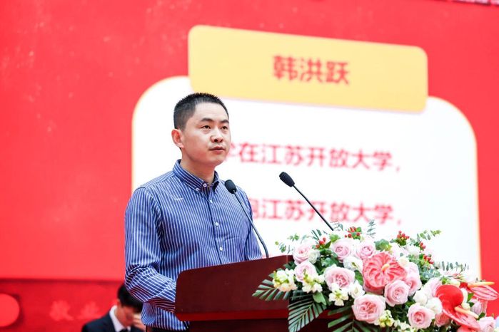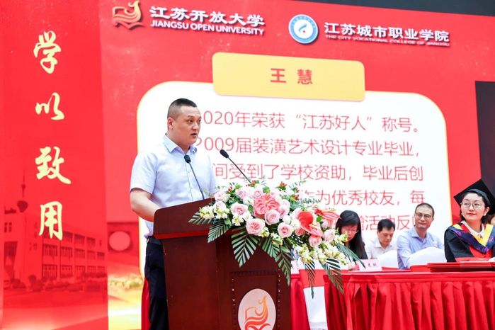 校友代表、南通起点广告传媒有限公司总经理王慧以“饮水思源”的爱心行动回馈母校,用继续攻读江开本科学习践行终身学习的理念,努力成为江苏开放大学新一代娇子。