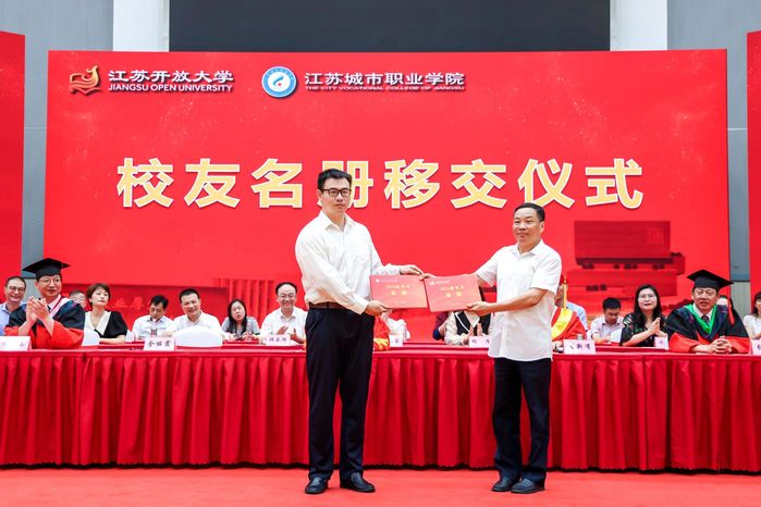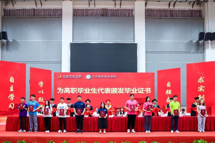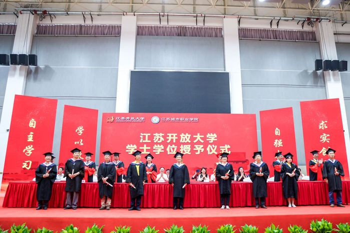 同学们刻苦学习、砥砺奋进,用累累硕果为大学时光交上了一份份圆满的答卷。副校长张晓宣读2021届优秀毕业生表彰决定和江苏开放大学2021年春学士学位授予文件。副校长尤佳春宣读2021届校友联络员名单。全体校领导为优秀毕业生代表颁发荣誉证书,为专科毕业生代表颁发毕业证书,为本科毕业生拨穗正冠、授予学位,为校友联络员代表颁发聘书。教务处处长钱琦向校友联谊会办公室主任刘涛移交2021届毕业生校友名册。