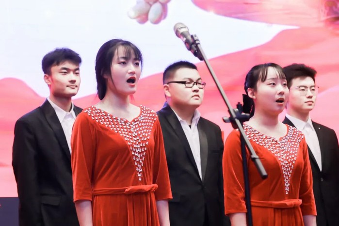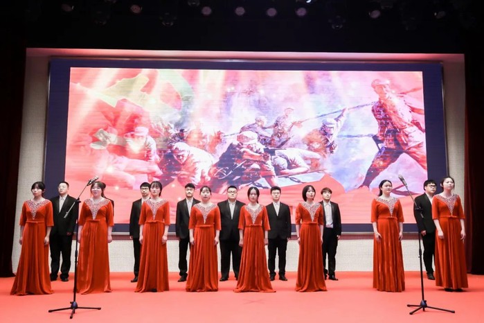 校大学生艺术中心合唱团献上了精心编排的合唱《在灿烂阳光下》《没有共产党就没有新中国》,用优美的歌喉表达了对党的歌颂,以及新时代青年传承红色基因的信念。
