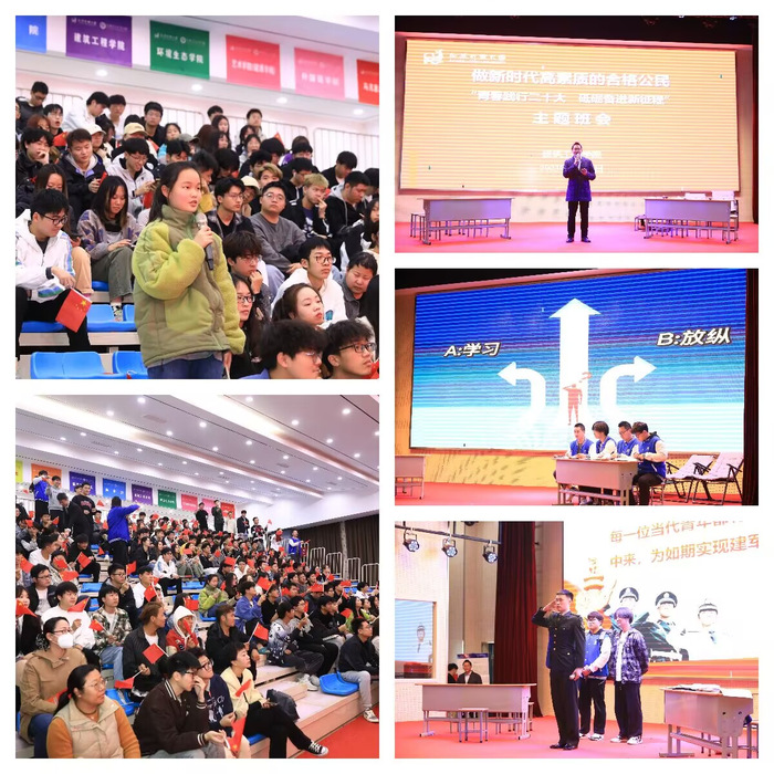3月30日下午,建筑工程学院以《做新时代高素质的合格公民》为题,在应天校区体艺馆406多功能厅,召开了2023年春学期“开学第一次主题班会”,分享践行党的二十大精神,围绕“爱国、团结、奋斗、科学、互助”五个关键词,通过学生们自编自导自演的情景剧,引导同学们思考如何做新时代高素质的合格公民,如何将“小我”成长融入“大我”奋斗,让“小我”的青春里有“大我”的家国情怀,责任和担当。江苏开放大学党委副书记、副校长金丽霞,建工院党总支书记曹永、副书记徐亚,校学工处、团委负责人、各学院党总支副书记和学工办主任现场观摩,建工院全体辅导员与21级、22级学生代表一起参加了主题班会。