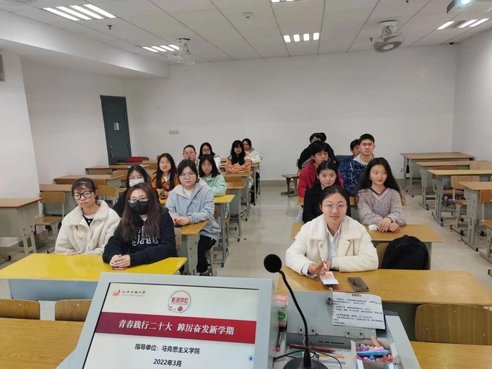 应天校区的理论学习由张丁月老师进行主讲,围绕“青春践行党的二十大 踔厉奋发新学期”的主题,张老师提出四点希望:做新时代的有为青年要有理想主义追求、要有担当作为闯劲、要有吃苦耐劳精神、要有团结奋斗品质。主题学习结束以后,施欣妤等学生骨干进行了学习分享。