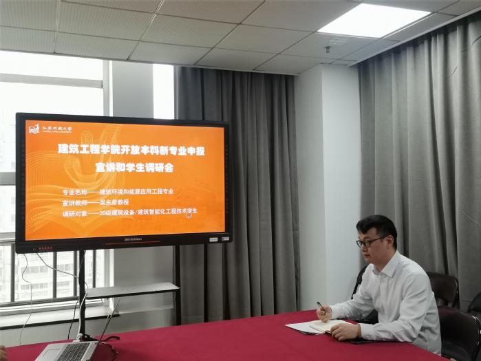 首先,韦定兵向学生宣布建筑设备工程系将于本年度申报开放本科新专业——建筑环境与能源应用工程;接着,杲东彦教授从新专业的人才培养方案、职业面向、人才市场需求以及与建筑设备、建筑智能化专业课程体系对接向学生作了一一介绍;最后,围绕“是否愿意报考”“影响报考开放学习的因素”“对新专业申报有何建议”等问题师生们展开热烈讨论,同学们纷纷表示,在科技水平迅猛发展的时代,终身学习十分必要,如果学校能提供与自身职业需求和职业发展相契合的继续学习途径,一定会选择参与学习,不断提升自我。