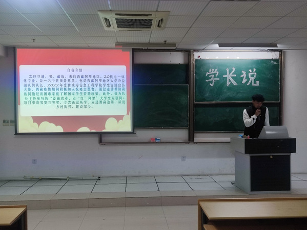 为充分发挥朋辈榜样引领作用,传承信工学子奋斗精神,4月14日,信息工程学院开展了本学期“学长说”第一期交流分享会。此次活动由学院优秀学生干部尚修坤、学生预备党员次旺旦增主讲,辅导员张铁成、李坤仪以及2021、2022级共80余名同学参加了分享会。