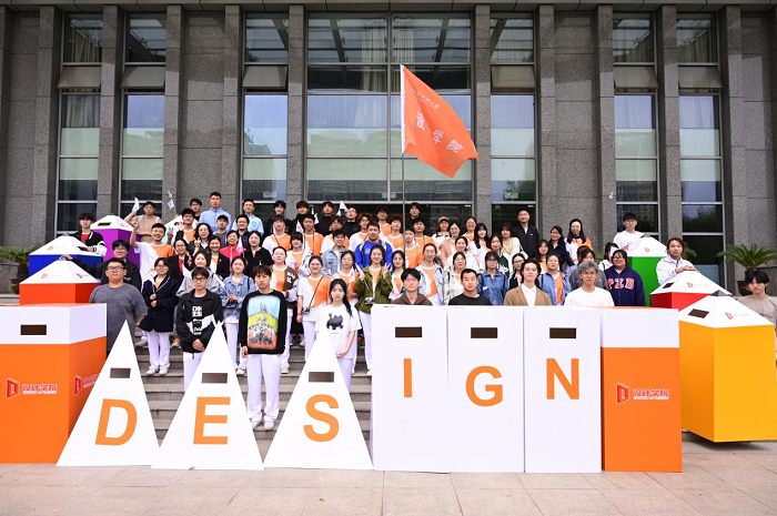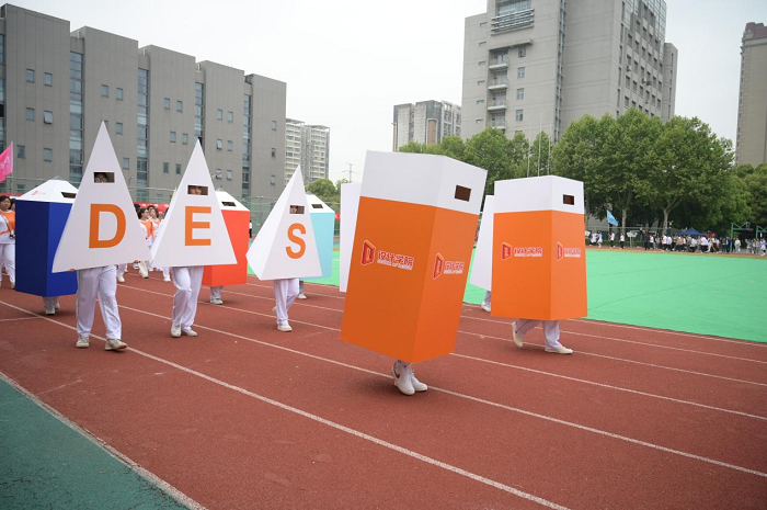 运动会开幕式上,同学们身背相机和画板,手持画笔,身着橙白相间的运动服,组成了充满青春活力且富有学院专业特色的方阵。用设计赋能,传承优秀文化,我们以梦想为马,拥抱数字时代!四周由院标、几何模型和彩笔造型组成的道具娃娃队伍憨态可掬,伴随方阵缓缓前行。“设计向未来,未来,看我的!”响亮的口号在体育场上回荡,亮眼的方阵展示着我院青年的青春、自信、活力和创意。