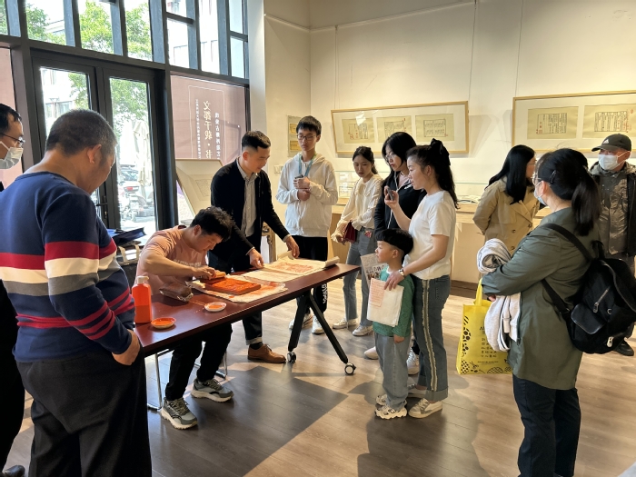 在展览现场,观众在阅读古典文学文本之时,还能感受每一份古籍制作成书背后繁复过程所蕴含的匠心,体会古籍的文字之美、版式之美、装帧之美。在体验区,同学们指导观众亲身感受雕版印刷技艺,观众们不仅可以体验《李太白诗》《陶靖节诗》《牡丹亭·游园》等雕版的印刷流程,还可将印制的成品带回家,为自己的学习和生活场所增添一份书香。