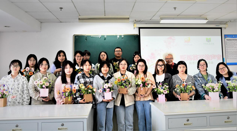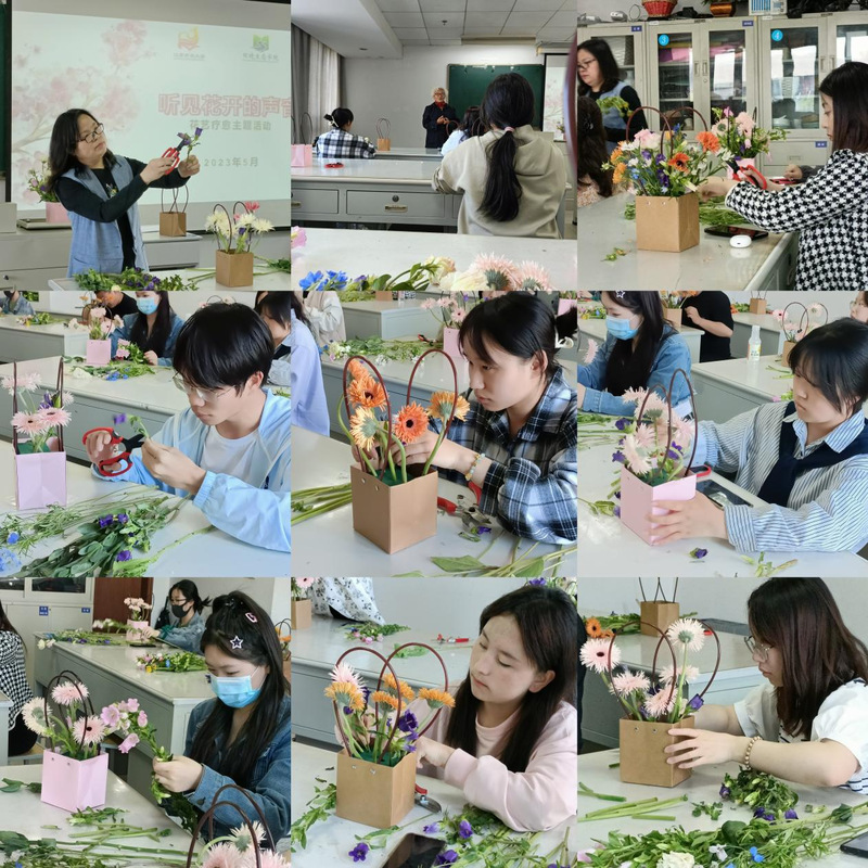 插花是心灵与自然的契合,是自然生态与人文情思互动的艺术,5月11日,环境生态学院举办了“听花开的声音”花艺疗愈主题插花活动。特邀校关工委石剑虹老师与学院少数民族学生,受助学生和班干部等学生代表一起动手,用花艺表达对母亲的感谢与祝福。校专职心理咨询师沈静老师和学院花艺专家梁海英老师别指导心理疗愈和插花技艺。活动由辅导员高媛媛老师主持。