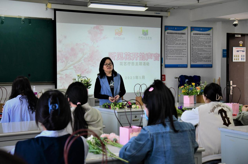 听完老师们的讲授,花香四溢的活动现场,同学们个个都跃跃欲试。选定花材、修剪花枝、摆弄造型……同学们充分发挥想象力和创造力,把原本普通的花草搭配得错落有致、赏心悦目。品花、插画、赏花,在自我体验、交流互动中,同学们的情绪得到舒缓和释放,内心得以平复与和解,自我价值获得肯定和满足。