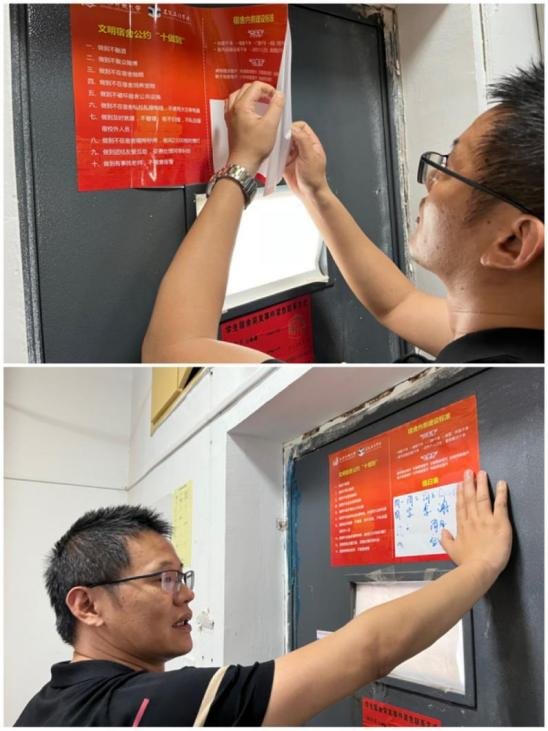 本次卫生检查包括寝室地面是否干净、床上用品摆放是否有序、宿舍环境是否整洁等。老师们在检查过程中张贴了学院精心设计的《文明宿舍公约“十做到”》,并叮嘱学生将宿舍值日表贴在空白处。22级辅导员崔璨表示,希望通过宿舍标准化建设帮助大一学生们培养良好的学习和生活习惯,帮助大家树立规矩意识、公约意识。