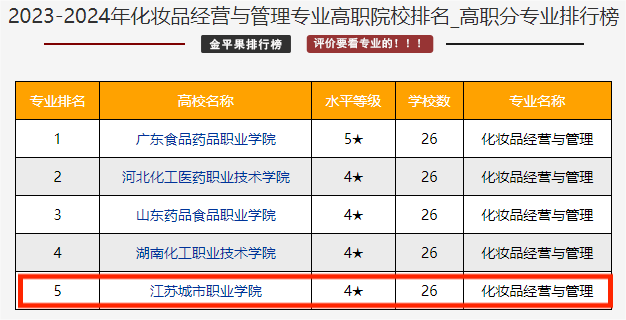 在新发布的2023-2024年高职分专业排行榜中,艺术学院人物形象设计专业位列全国人物形象设计专业102所高职院校排名第2名,化妆品经营与管理专业位列全国化妆品经营与管理专业26所高职院校排名第5名。