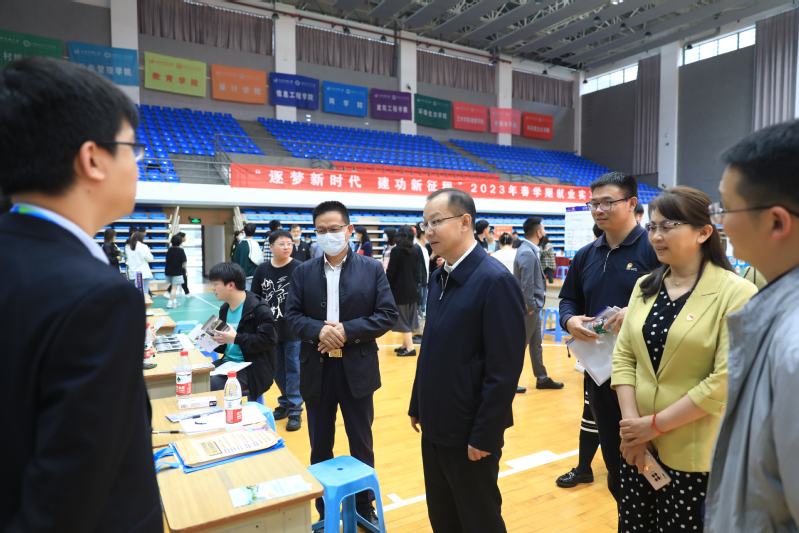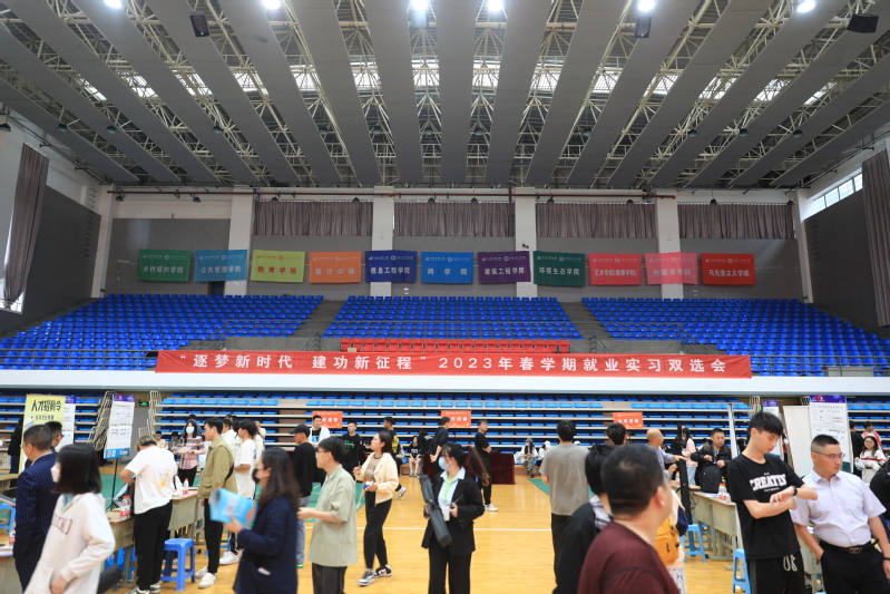 为推动学习贯彻习近平新时代中国特色社会主义思想主题教育走深走实,全面落实国家和省“保就业”“稳就业”决策部署,抢抓就业工作关键期,促进毕业生顺利就业,帮助大二学生找到合适实习岗位,5月24日下午,我校在应天校区举办“逐梦新时代 建功新征程·2023年春学期就业实习双选会”。来自省内外的近60家优质用人单位进校招聘,校领导、学院副书记、毕业班辅导员、相关教师,以及在校的毕业生及大二学生参加双选会。