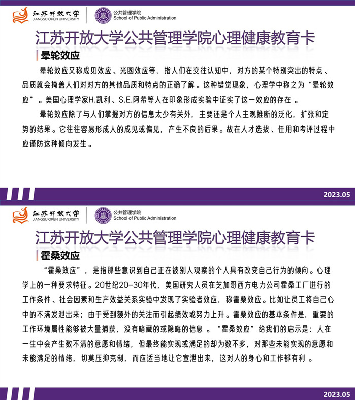 同时,学院还高度关注、积极做好思想政治教育和心理健康教育协同育人,创新网络思政育人路径,推动育心育德和在职学习相结合,继续为开放学员发放心理健康教育卡。五月份的心理健康教育卡带领学员学习“晕轮效应”“霍桑效应”,重点提高学员的判断能力以及明白什么样的行为才是同学和老师所接受和赞赏的,明白只有对自己施加积极的心理暗示,进行自我正向引导,不断地增加自己的良好行为,才可能受到更多人的关注和赞赏,也才可能让我们的学习、工作和生活不断进步,充满自信。